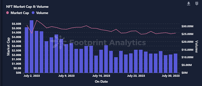 In July 2023, the volatility of the NFT market continued, characterized by declining trading volumes. However, the determined growth and resilience of certain sectors, such as gaming and music NFTs, stands out. This resurgence is reflected in the increasing number of unique users engaging with these niche sectors.
